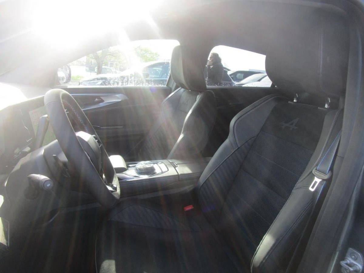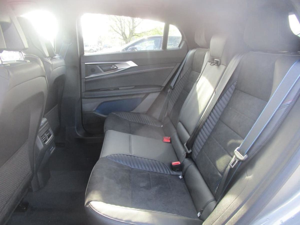 sellerie mixte alcantara avec surpiqûres bleues et logo alpine lumineux