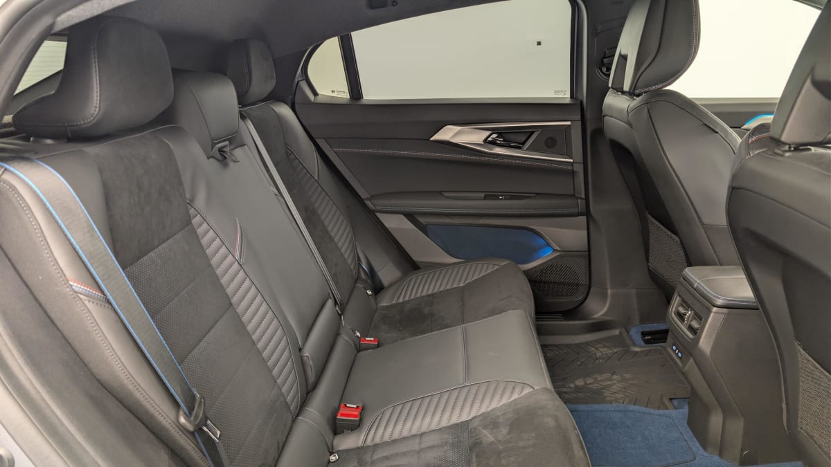 sellerie mixte alcantara avec surpiqûres bleues et logo alpine lumineux